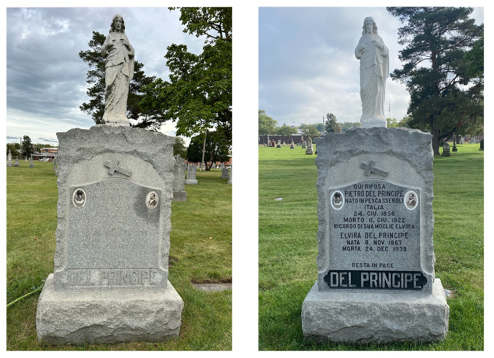 We hired Glen, the owner of Memories in the Making. He removed the lichen growth from the statue and cleaned the dirt and stains from the granite. For the second phase he applied a dark grey Lithichrome paint to the engraved letters and the background of our family name. Lastly Glen cleaned and caulked the area surrounding Elvira and Pietro’s cameo photos. Thank you to all who contributed!