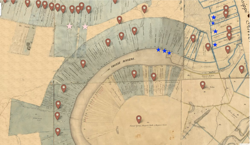 Both sets of Zenon’s grandparents, the Porche and Richie ancestors, owned numerous large plantations along the False River and the Mississippi River about 100 miles north of New Orleans. The map below is courtesy of LSC Berkeley and the Louisiana Slave Conspiracies research team. You can click here to read how they stitched together who owned plantations in the 1790’s. The blue stars were Porche plantations and the pink stars were Louis Riche (Zenon’s grandfather) plantations. One of Louis Richie’s plots was 304 acres, the other was 406 acres.