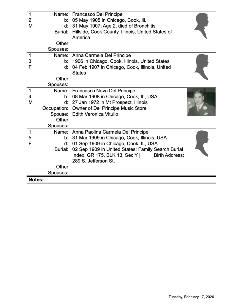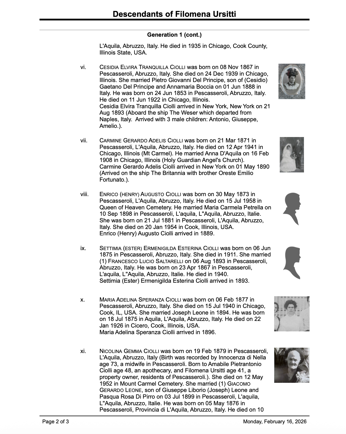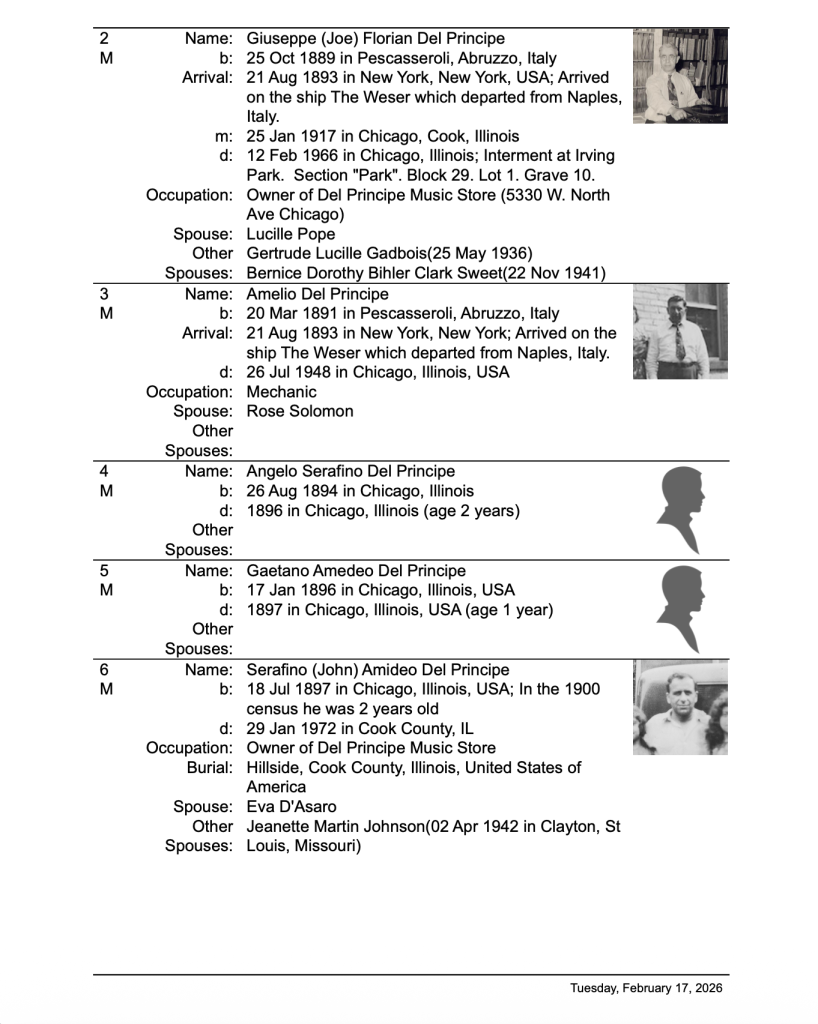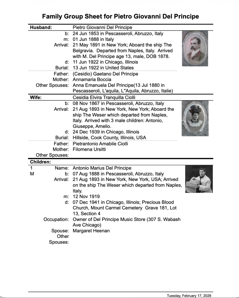 My great grandmother Elvira is in the center, my grandfather Gilbert is seated far right. The children in the front row from right to left: Leona & Margie (John’s children), Elvira (Antonio’s child), Annie (Emil’s child), Eileen (Antonio’s child), Eleanor (Emil’s child). Next row right to left: Willie, Margaret, Elvira (holding Petey), Sue, and Gilbert. In back of Gilbert left to right: John, Otto, in back of Otto is Bernie, Rose, Frank, Emil, Tony. Back row is Paul.